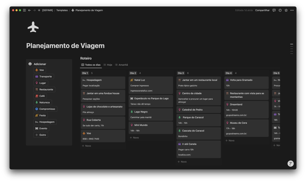 Um sistema completo no Notion para organizar itinerários, reservas, atividades e dicas, garantindo que você aproveite ao máximo suas viagens.
