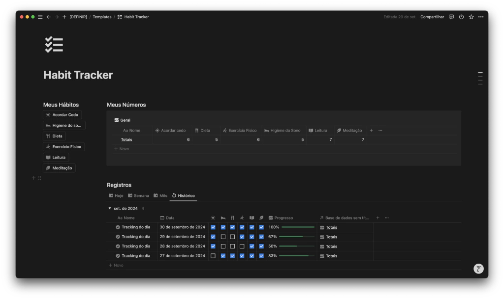 Um rastreador de hábitos no Notion que ajuda você a acompanhar suas metas diárias, desenvolver consistência e manter a motivação para um estilo de vida mais saudável.